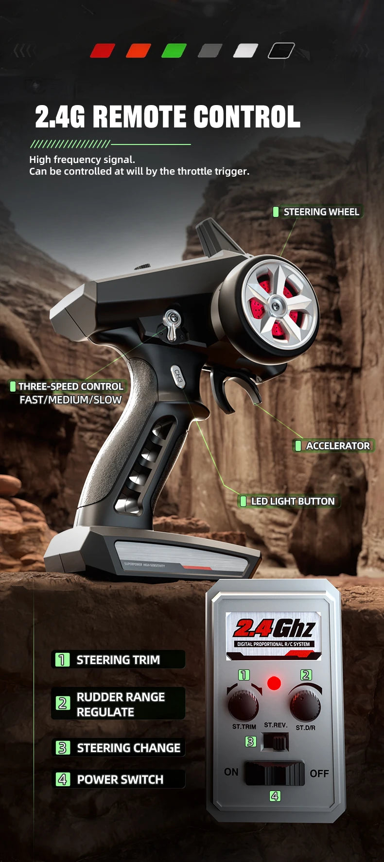 6. Equipado com volante profissional: evita capotamento causado por muita potência na partida, mas também melhorou no pouso em declives, ajustando a estabilidade da carroceria;