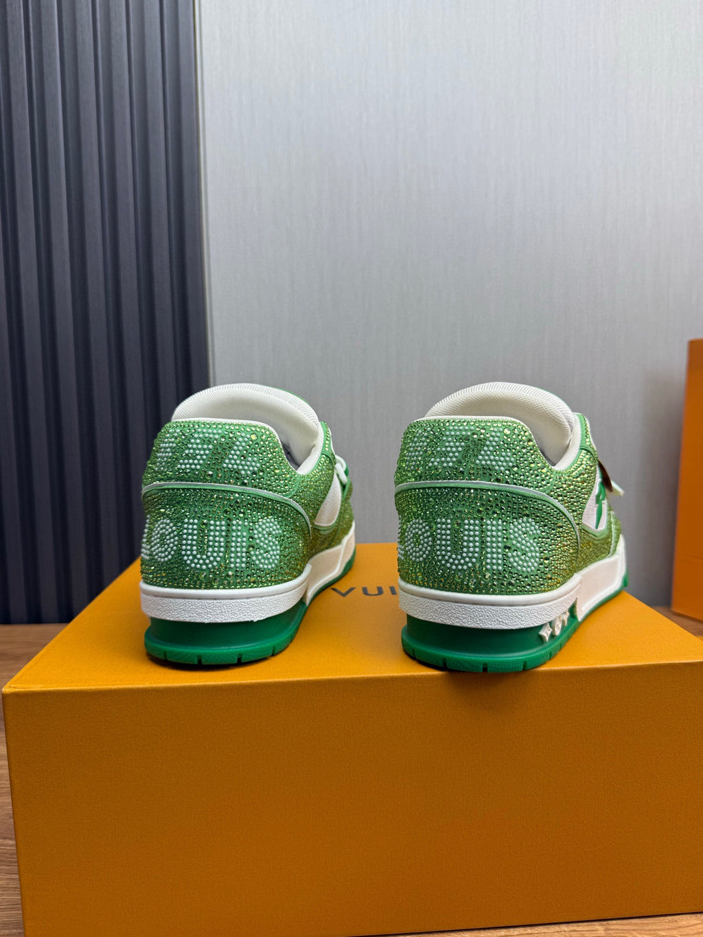 Louis Vuitton LV Trainer na cor branca e verde, especificamente a versão adornada com cristais ou strass. Este modelo icônico, originalmente criado por Virgil Abloh e inspirado em tênis de basquete vintage, apresenta um design distinto com as iniciais LV na lateral e flores do Monogram na sola de borracha.