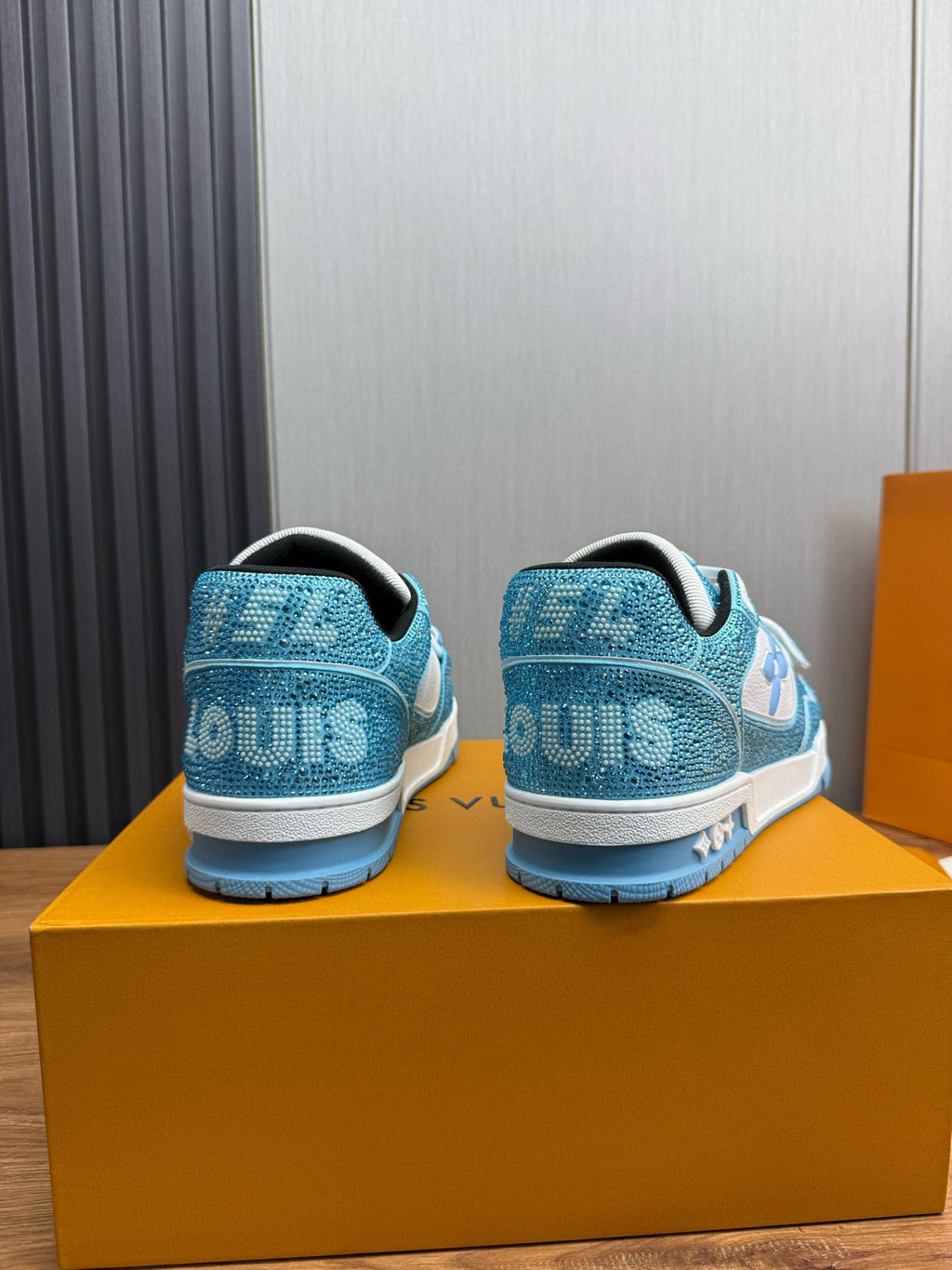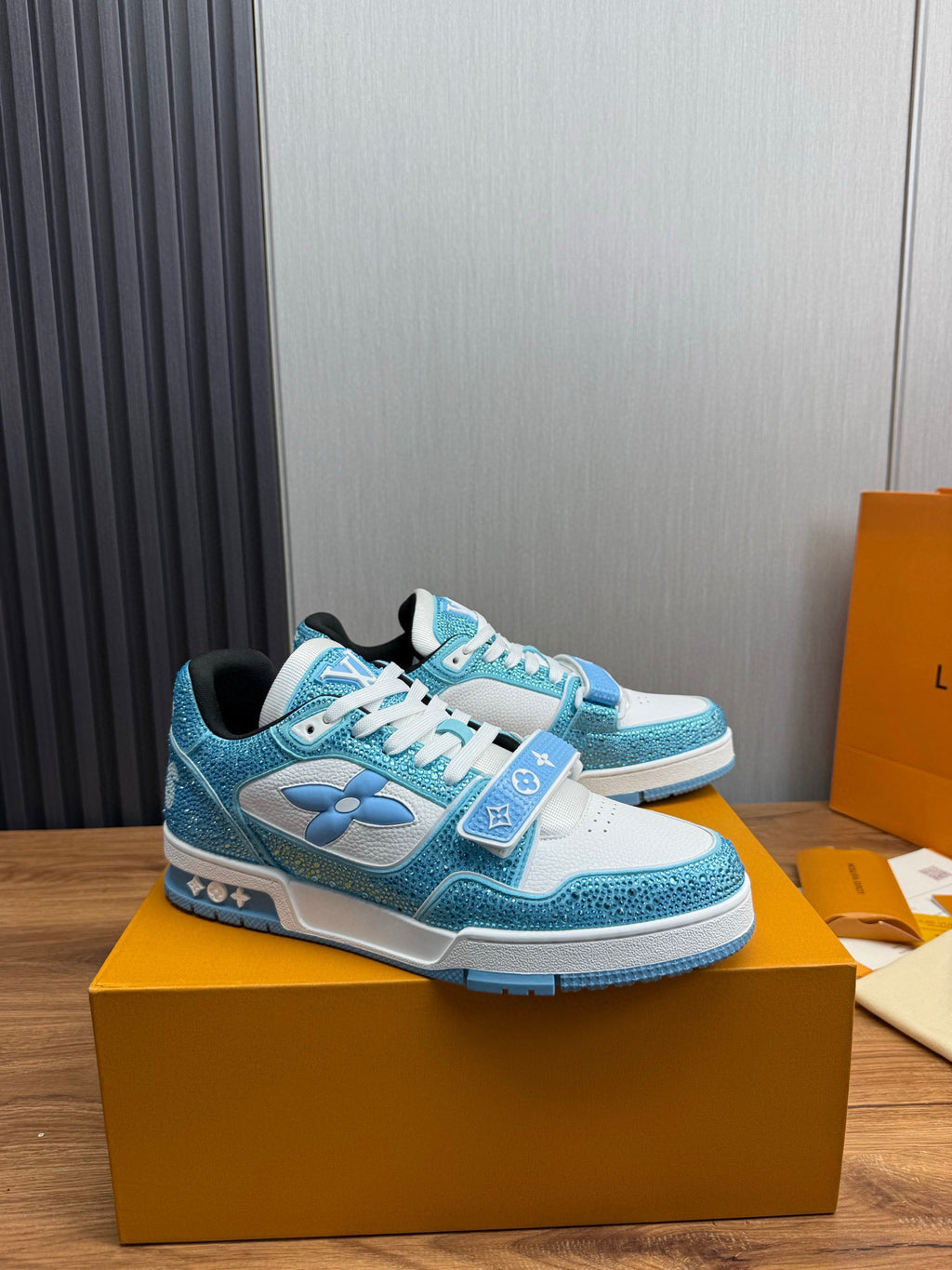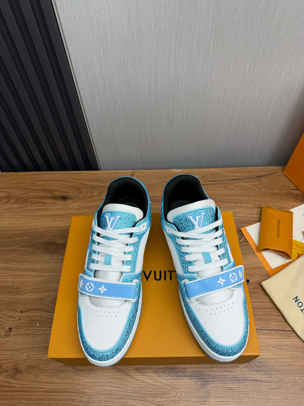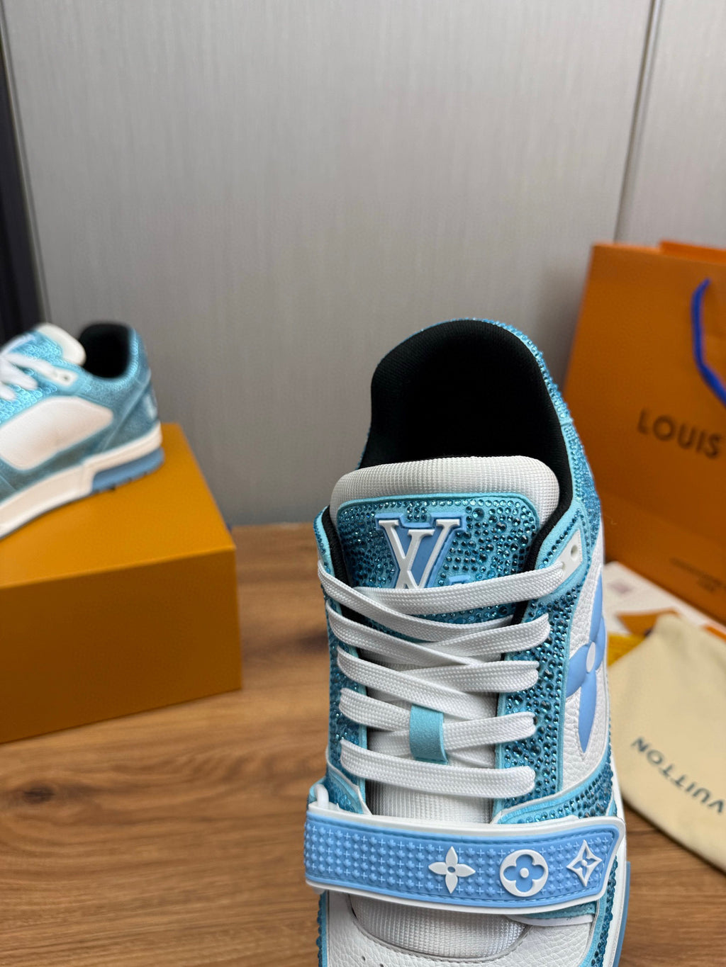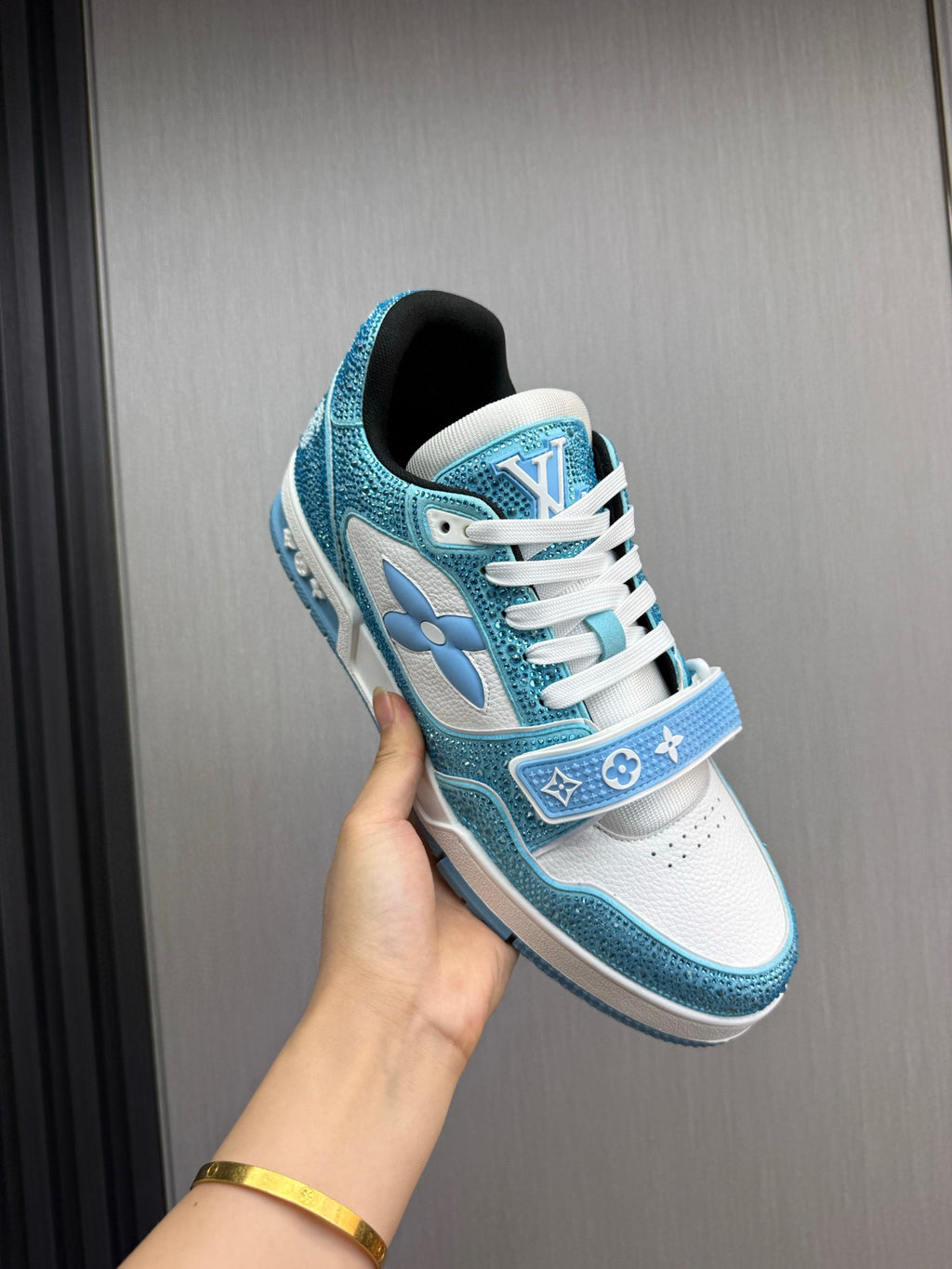 Tênis LV Trainer da Louis Vuitton na cor azul com detalhes em branco e cristais, uma edição especial do modelo icônico.
