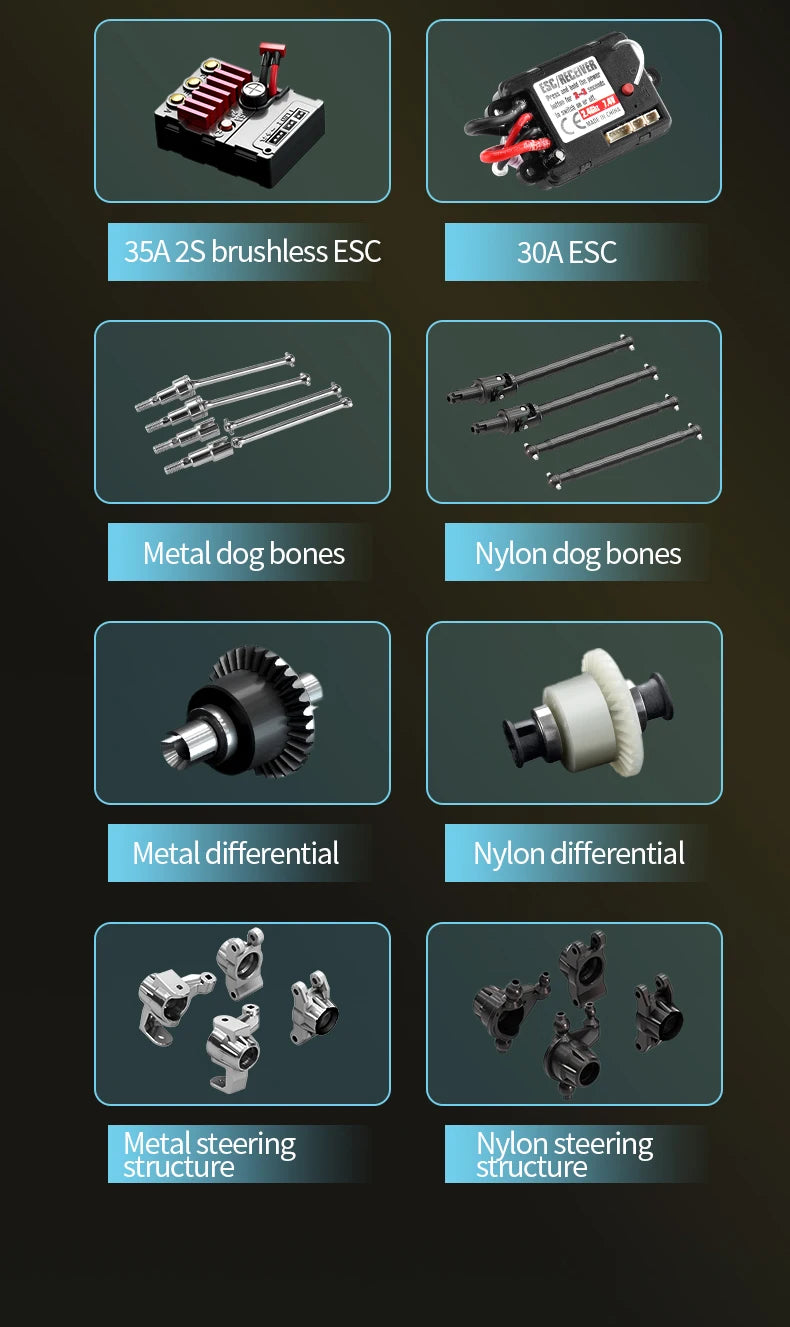 Escala 1:16 | Proporção | Aceleração | Frequência 2.4G | Luz LED | Pneus ocos | ESC 35A 2S à prova de respingos | Servo 17G | Diferencial | Torneamento de metal | Amortecedor | Rolamento de esferas | Bateria de lítio | Chassi off-road | Todos os terrenos | 4x4 | Pedal do acelerador