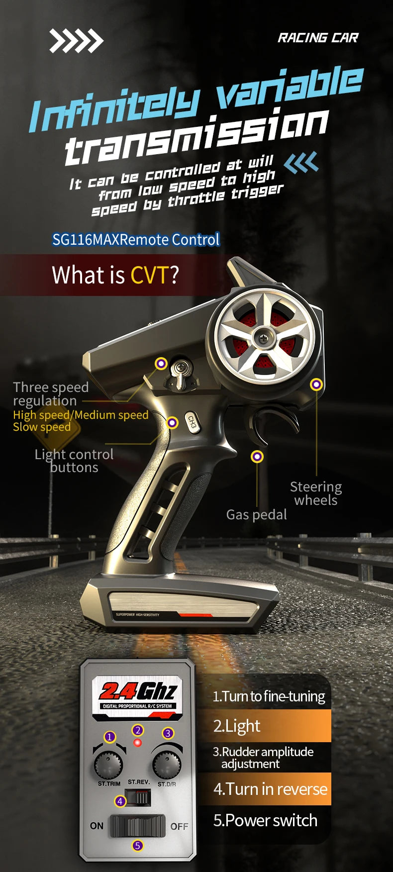 4. Sistema de controle remoto síncrono 2.4G em escala real. Acelerador/direção em escala real;
